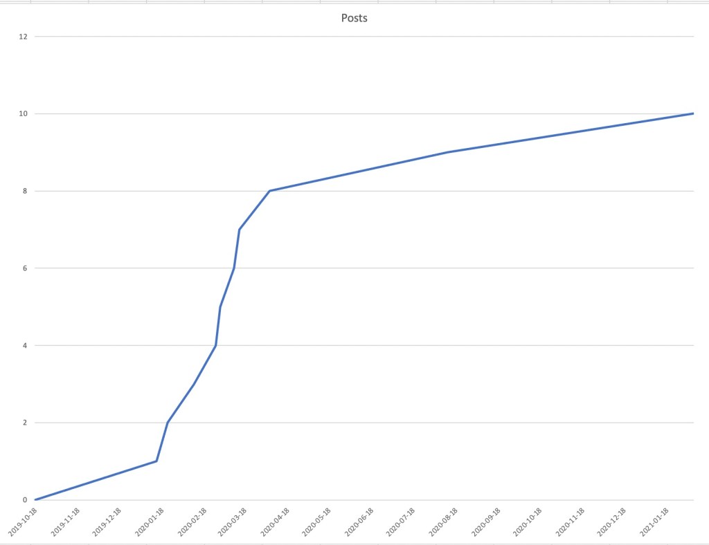 Let’s sketch a timeline. On October 18, 2019, I wrote the very first blog post on this site. The first post in the series On the complexity of change appeared about three months later. Over the last year or so, only 10 posts appeared.